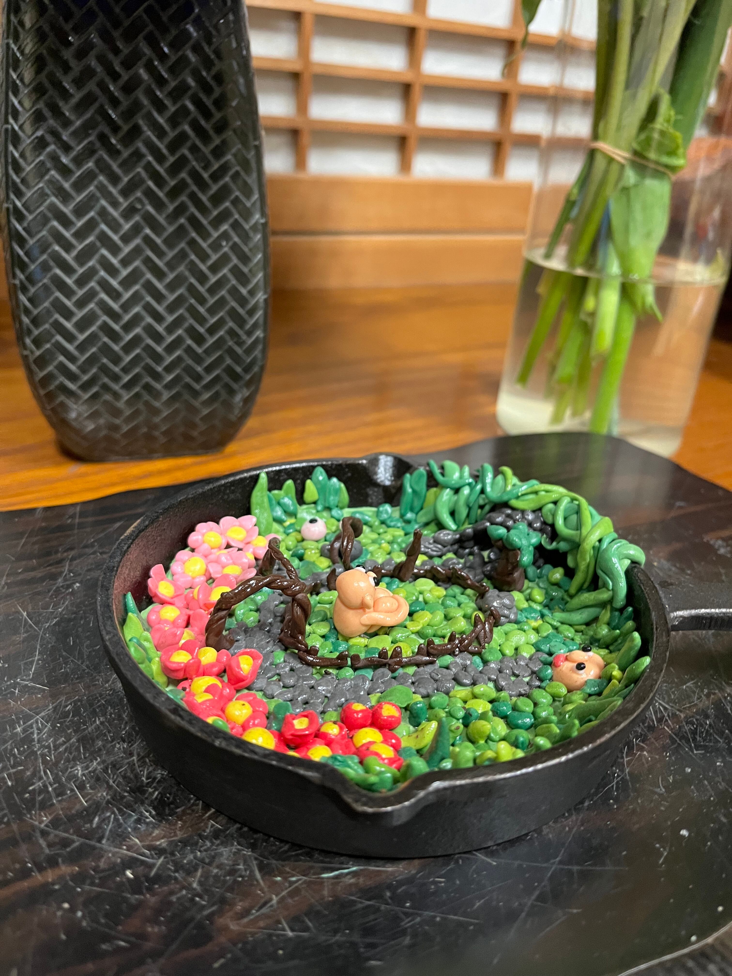 樹脂粘土で丁寧に制作された、夢のようなスキレットの中に広がる小世界置物です。幻想的なデザインが魅力で、お部屋のインテリアを一層引き立ててくれます。